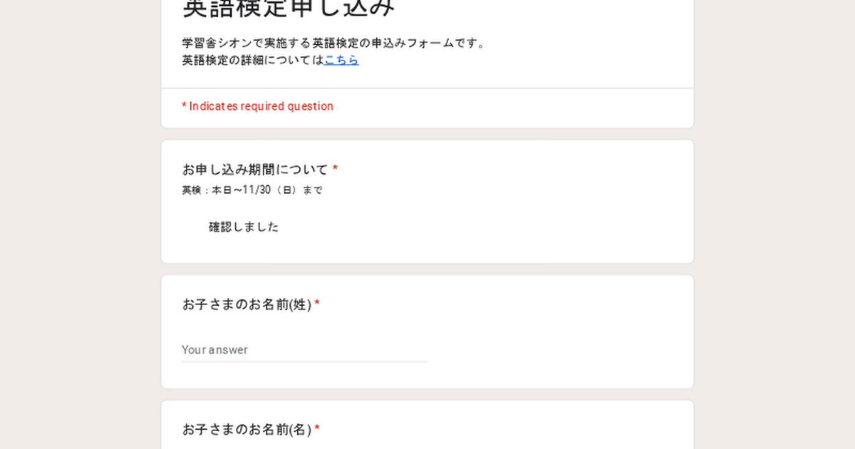 学習舎シオンで実施する英語検定の申込みフォームです。英語検定の詳細についてはこちら